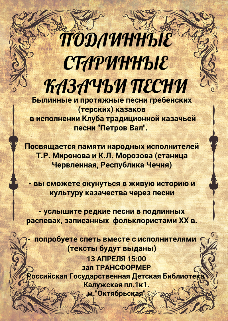 В исполнении клуба «Петров Вал» прозвучат былинные и протяжные песни в аутентичных распевах, записанных фольклористами XX века.